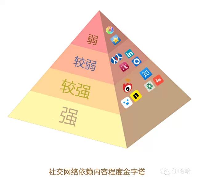 我们可以发现第三层除了微博这个社交媒体之外,都是「社区类的应用」。而社交媒体和社区类的产品对内容有着过分的依赖,这时候关系的金字塔就变成了内容依赖金字塔。