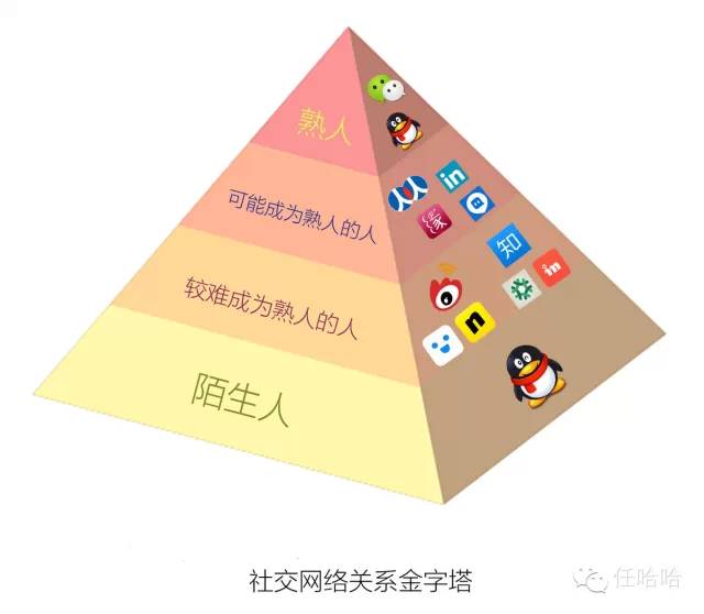 纵观社交网络的发展过程,除了微信这种有能力迁移存量(导入QQ关系)的产品之外,每一款新的社交产品都是在金字塔的底部陌生人中切分出了一种新的关系。庞大的人群中有很多线索可以寻找,在金字塔中再切分出一块来也不是不可能。