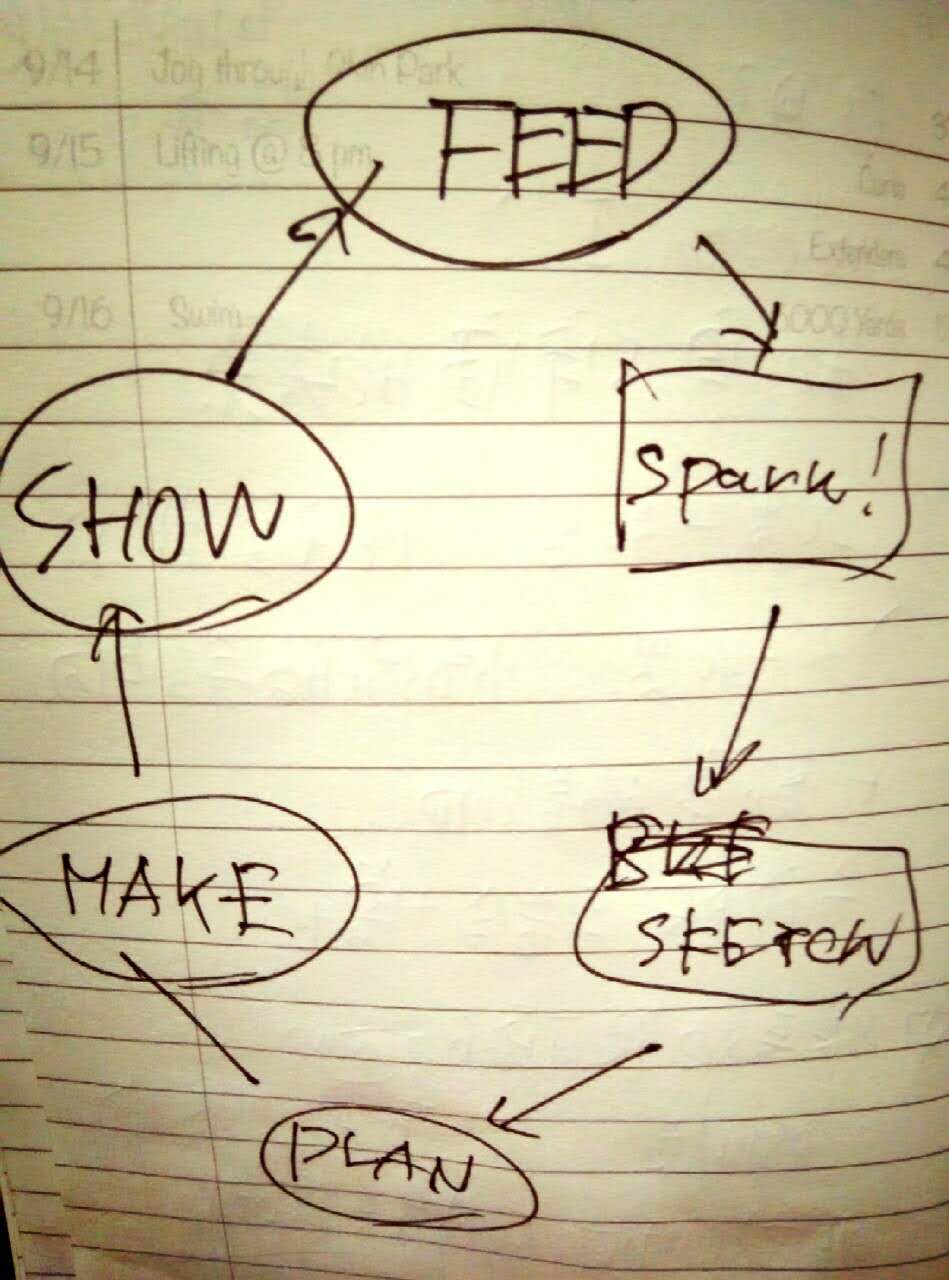 每个独特的创作者都有最独特的创造方式,士佐信道的创作就喜欢在吵闹的咖啡厅,吵闹的声音越能激发他的灵感。他把自己的创作过程定义为一个循环:Spark-Sketch-Plan-Make-Show-Feed,意思是灵感产生后,需要去构思,画图,再去制作,展示,通过展示而得到了反馈继续激发他的灵感。