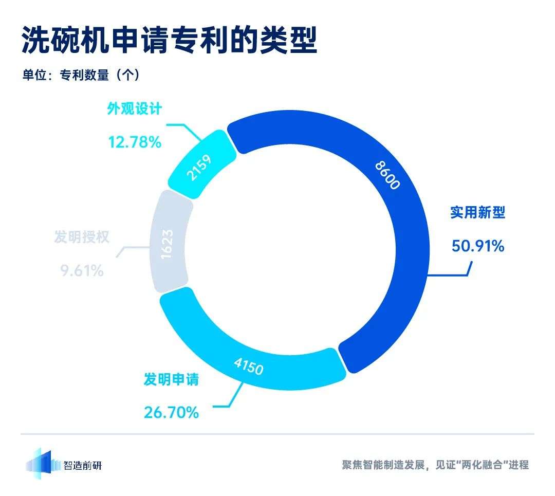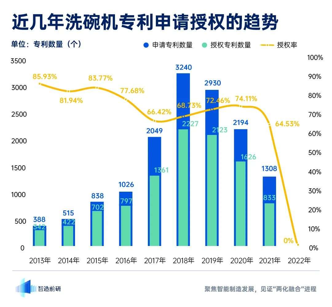 智造前研统计了我国洗碗机申请专利数量前十的公司的 16892 组专利申请,观察了近几年洗碗机专利申请授权的趋势,我国的电器生产技术能力在飞速地提升。