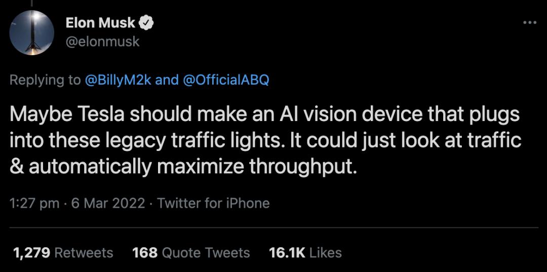 不仅如此,当天下午,马斯克还对这一抱怨的解决方案说出了自己的构想,“也许特斯拉应该为红绿灯做一个AI视觉装置,从而根据实际的交通与车流情况最大化吞吐量。”
