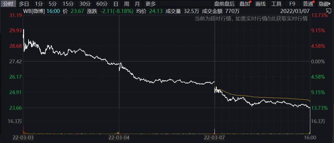 尽管财报数据亮眼,资本市场的反馈却截然相反。3月3日财报公布后,微博股价持续下跌,3月8日一度跌至23.66美元,野村分析师Jialong Shi更将微博评级从“买入”调至“中性”,其在研报中表示,由于宏观不利因素影响,微博2022财年增长前景依然不明朗,微博管理层已对电商直播、教育、房地产等垂直行业疲软发出警告。