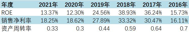 另一方面,从ROE(净资产收益率)、销售净利率,以及资产周转率三个数据维度来看,从2016年起,ROE从最高的38.93到2021年的13.37;销售净利率从2018年的33.32降到2021年的18.25;资产周转率从2016年的0.7降到2021年的0.33,数据均表现腰斩。