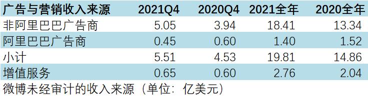 微博广告又分为两种,一种是非阿里巴巴广告商,一种是阿里巴巴广告商。相较于2020年全年广告营收阿里巴巴广告业务占比10.23%,2021年,微博两种广告业务均有增长,但阿里巴巴广告占比有所下降为7.05%,非阿里巴巴广告业务占比上升。