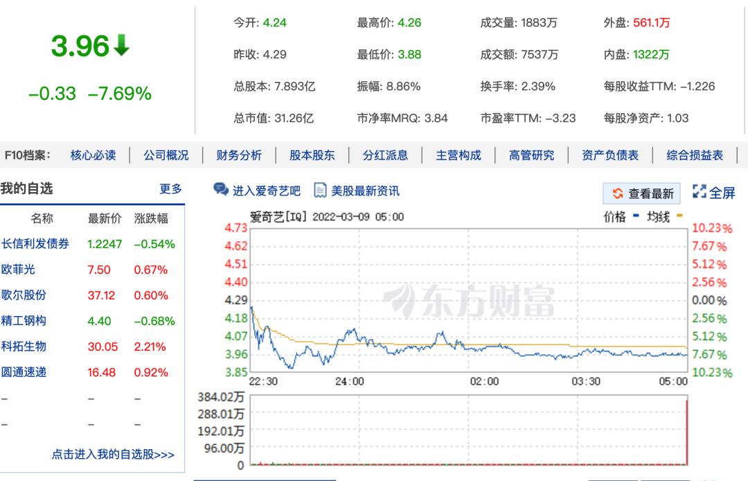 受财报利好的影响,3 月 1 日美股收盘时,爱奇艺报5.03美元/股,股价大涨 21.5%,总市值39.7亿美元,盘中涨幅一度近40%。截至发稿前,爱奇艺的股价降至3.96美元/股,市值31.26亿美元。