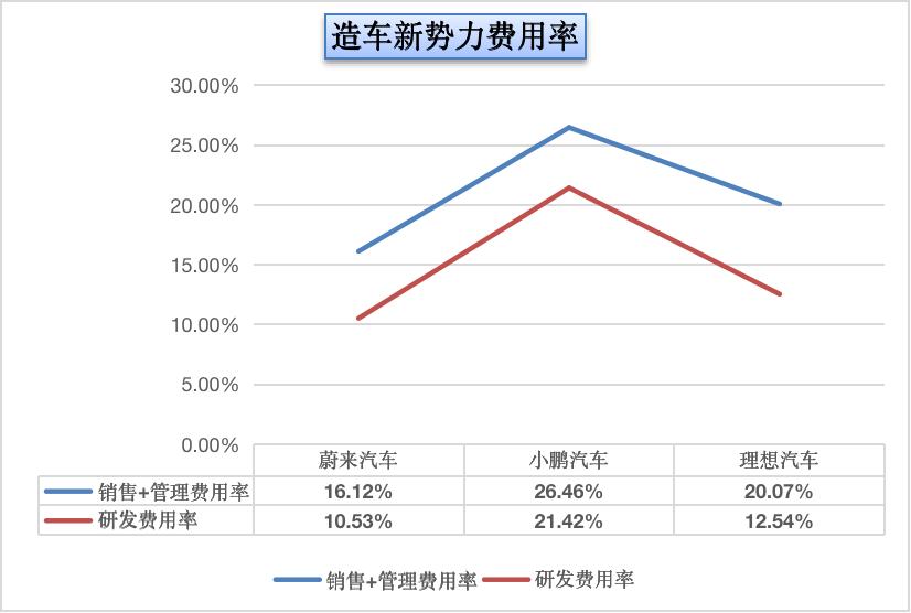 再来看比例更高的销售、管理费用。截止2021年三季度,蔚来、小鹏、理想的销售+管理费用分别为42.29亿元、32.9亿元、23.37亿元,占比销售收入的比重分别为16.12%、26.46%、20.07%,已经和毛利率基本持平,所以想不亏很难。