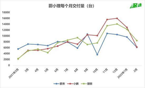 公司披露数据,截至目前蔚来共向用户交付智能电动汽车18.3万辆,其中2021年蔚来汽车年交付量为9.1万辆。而截至到2月28日,理想汽车累计交付量仅达到了14.4万辆;小鹏截至到1月底,累计交付量超过15万辆。