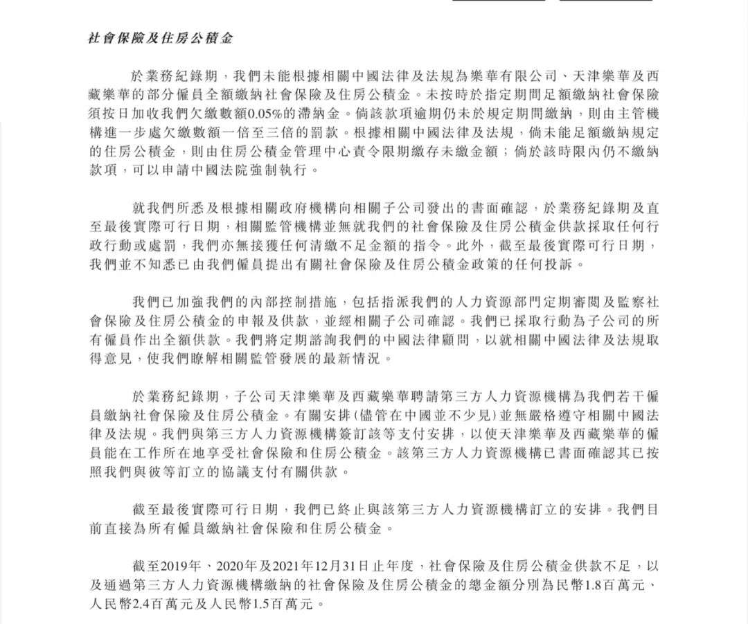 招股书透露公司未根据相关法律法规为乐华有限公司、天津乐华以及西藏乐华的部分员工全额缴纳社保及住房公积金。子公司天津乐华和西藏乐华聘请的第三方人力资源机构负责相关事宜,但其并未遵守规定。