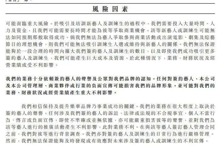 第二,艺人的声誉和公众对公司的品牌认知非常重要。乐华娱乐在招股书中表示,公司业务很大程度上取决于签约艺人的声誉。任何涉及签约艺人的诉讼、法律或者法规的不合规事宜、个人不当行为、传言或者负面宣传,即使不准确或者没有依据,仍然可能严重损害艺人声誉。同时也对公司业务产生不利影响。