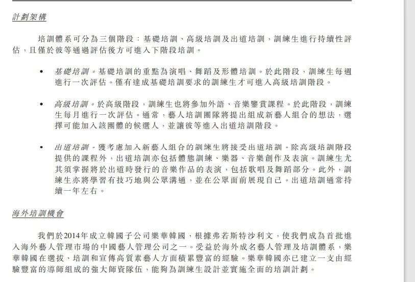 乐华娱乐表示,公司选拔训练生主要于国内并且通过线上、线下多渠道进行。截至2021年12月31日,公司已与30家艺术院校以及艺术培训机构合作,于校内外举办训练生选拔活动。此外,公司也接受个人在线申请并通过社交平台推荐发掘潜在候选人。