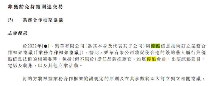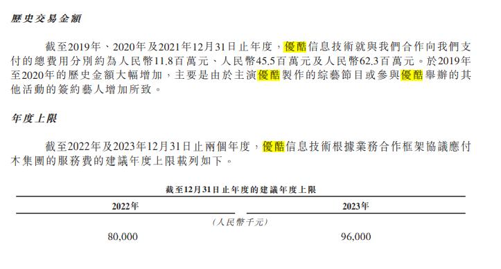 招股书还显示,截至2019年、2020年及2021年12月31日止,优酷向乐华娱乐支付总费用分别为1180万元、4500万元及6230万元,三年共计约1.2亿元。并且截至2022年及2023年12月31日两年度,优酷根据业务合作框架协议应支付乐华集团的服务费建议年度上限分别为8000万元及9600万元。