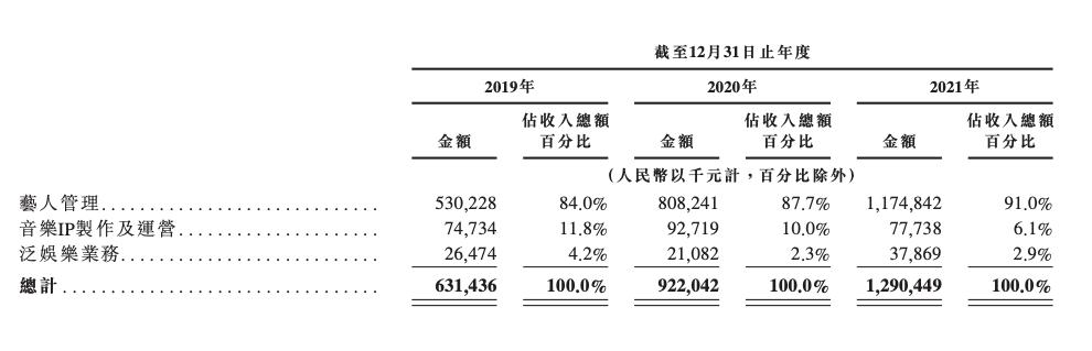 乐华娱乐的收入来源包括:艺人管理、音乐IP制作及运营及泛娱乐业务。2019年、2020年及2021年,乐华娱乐分别录得收入6.31亿元、9.22亿元及12.90亿元。其中,艺人管理为其主要收入来源,2019年、2020年及2021年分别收入5.30亿元、8.08亿元及11.75亿元,分别占同期总收入84%、87.7%及91%。
