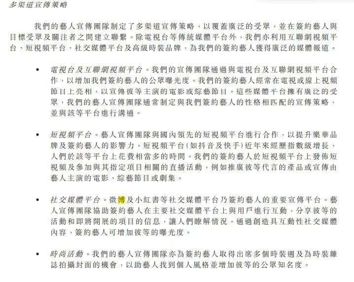 招股书表示,艺人宣传团是建立艺人与观众沟通桥梁的关键环节。宣传团队通过发布宣传材料来帮助艺人增加曝光率,以及在社交平台上发布与艺人有关的新闻、动态等。若签约艺人面临潜在不利宣传,艺人宣传团队还要及时作出反应并制定适当回应。