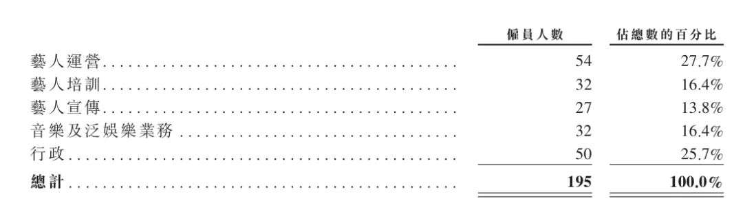 招股书显示,195名员工中,负责艺人运营员工数54人;负责艺人培训员工数32人;负责艺人宣传员工数27人;负责音乐及泛娱乐业务员工数32人;行政方面员工数50人。