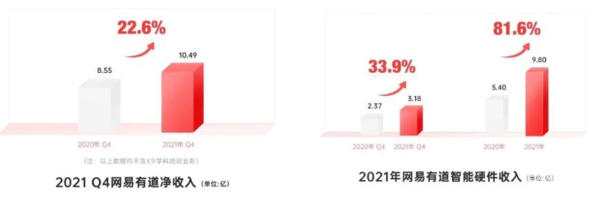2月24日,网易有道(NYSE:DAO)公布了2021年第四季度及2021财年未经审计的财务报告。财报显示,网易有道2021年Q4净收入达10.49亿(不含 K9学科培训业务),同比增长22.6%。其中,智能硬件板块营收表现最为亮眼,实现了两位数的增长。