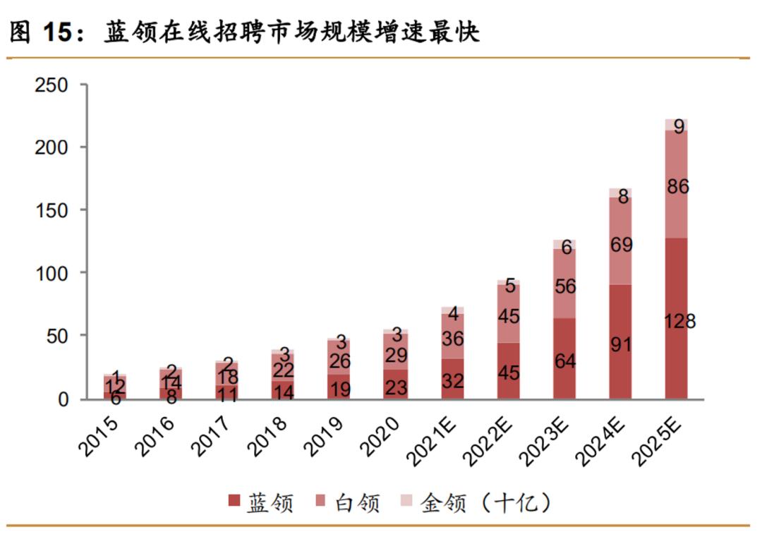BOSS直聘招股书显示,中国蓝领群体2020年至2025年应聘过程的线上化率,有望从13%提升至29.9%,蓝领在线招聘市场规模或将由22.8亿元提升至128.5亿元。