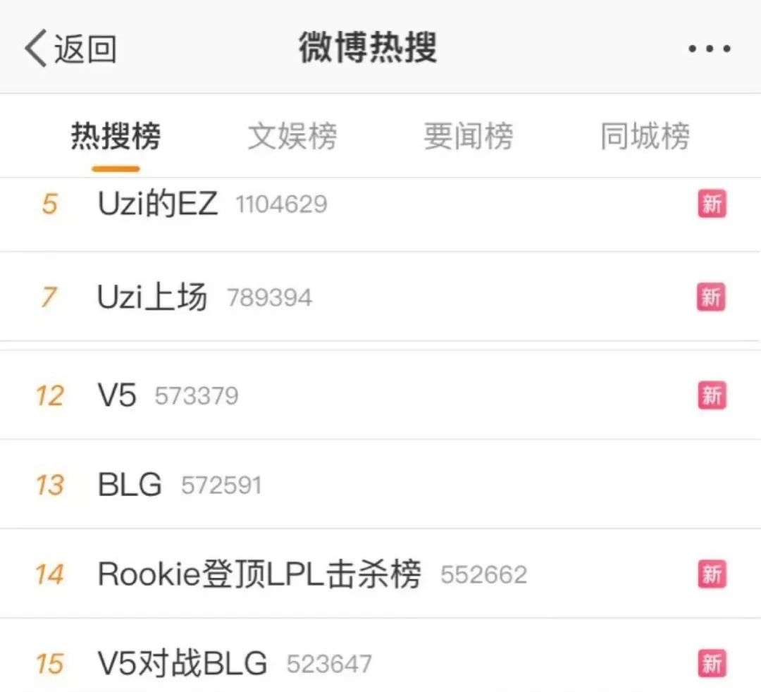 不太了解电竞的朋友,昨晚在群聊里发出了这样的一声感叹。打开微博一看,在Uzi复出的第二场比赛结束后,热搜前15条有6条与这场比赛有关,对于非电竞用户来说,这样的密集程度的确令人咋舌。