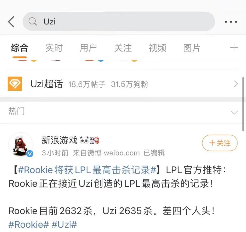 作为电竞观众,能够理解的是,这是一段时间以来,由于Uzi无法上场所压抑的期待值厚积薄发的结果。但在比赛前一晚的热搜,就多少有些让人摸不着头脑了。上热搜的词条是#Uzi#,但点进去发现热搜的内容是“Rookie即将打破LPL最高击杀纪录”的新闻资讯。明明新闻的主人翁是Rookie,为何上热搜的却是当背景板的Uzi?