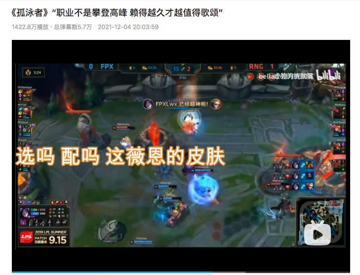 这些梗还都无一例外地被创作进了B站上的一个知名二创视频中——《孤泳者》。该视频累计获得了1422.8万播放(在笔者写下这篇文章的时候还有300人正在观看),是在不少B站用户眼中可以被视作“镇站之宝”的存在。而之所以它能够如此大受欢迎,离不开许多电竞观众“苦Uzi粉丝久矣”的心理状态。