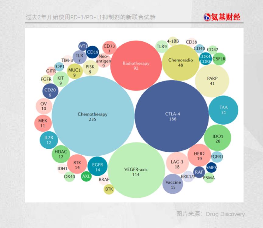 在一项研究中的数据显示,2017至2019年中启动的PD-1/PD-L1 抑制剂的新的联合方案研究中,PD-L1/PD-1能与化疗、CTLA-4抑制剂、VEGF受体等多种药物进行联合疗法。