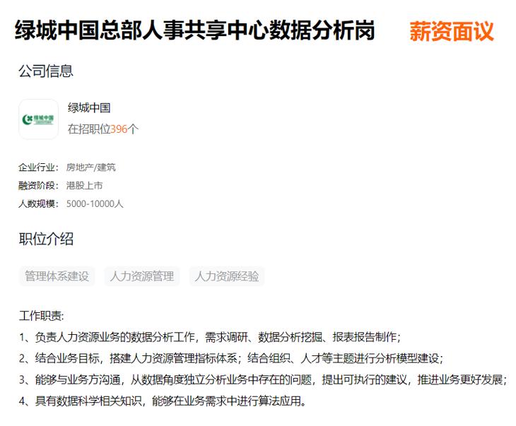 有些大厂会将这种数据分析的职责放大,形成单独的岗位,通常叫做“HR数据分析”。 绿城就在HRSSC中设置了这样的岗位: