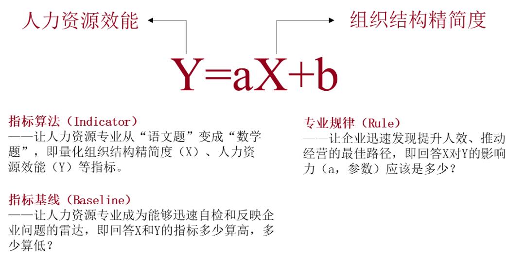 一是指标算法(Indicator),即找到量化组织结构精简度(X)、人力资源效能(Y)的指标。这让人力资源专业从“语文题”变成“数学题”。这个方向上考验的既是设计者的数据思维(Data Mind),也是设计者对于人力资源专业的理解。现在谈人力资源指标的机构不少,但说实话,指标有没有才华,是不是油腻,明眼人一眼就能看出来。