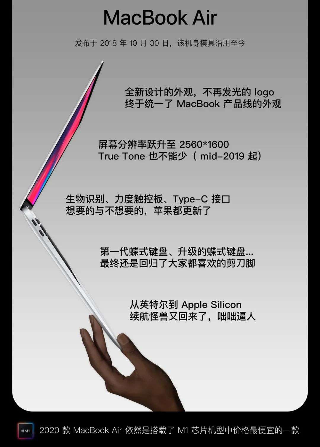 但是苹果作为苹果,在循规蹈矩的时候也总是能够掏出一些让人猝不及防的产品,这其中就包括发布于 2020 年 11 月 10 日的使用了 M1 芯片的最新款 MacBook Air ——就在 M1 款发布的半年多前,苹果刚刚为 MacBook Air 在英特尔处理器范围内做出了最后一次性能升级,允许用户最高配置到 16 GB 的运存和 10 代 i7 处理器——堪称一次经典的「背刺」行动。