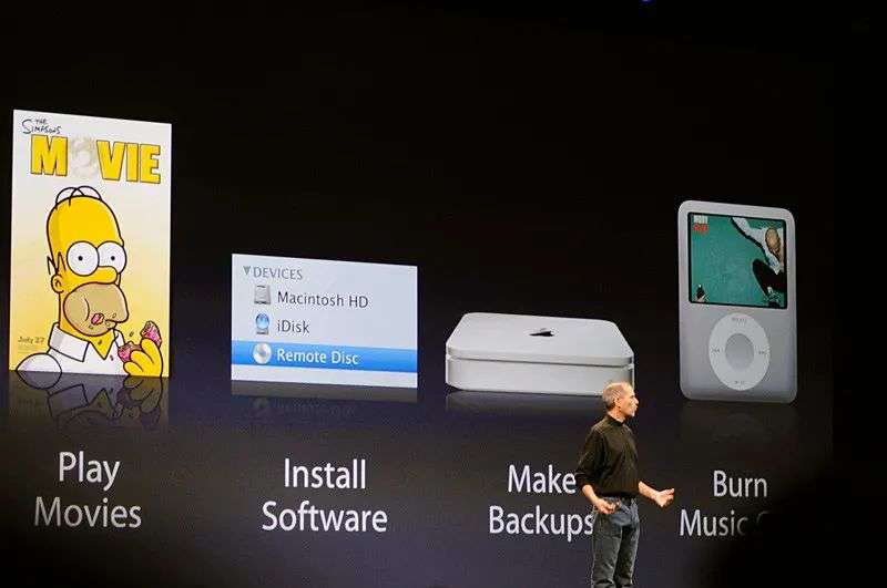 尽管如此,光盘作为彼时仍然很重要的数据载体,哪怕乔布斯在发布会上将 MacBook Air 定义为一台为无线而设计的机器(MacBook Air was built to be a wireless machine),也依然需要为砍掉的光驱寻找一个替代方案——毕竟购买 MacBook Air 时的很多支持软件都还是附赠在光碟中的——除了一并发布的一款 USB 接口的外置光驱 Apple SuperDrive 之外,乔布斯还在发布会上花了不小的篇幅介绍了 OS X Leopard 中添加的 Remote Disc 功能:通过安装对应的软件, MacBook Air 可以借用局域网中其他 Mac 或者 PC 的光驱进行程序安装或者光碟烧录。从结构与字面意义上看,这或许就是「云盘」早期的雏形之一吧。
