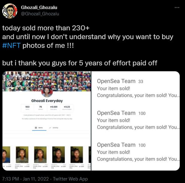 这样的成交价和匪夷所思的NFT项目,使他在社交媒体上爆红。他经常在Twitter上分享自己NFT头像的出售情况。甚至在爆火后仍然表示“我不明白你为什么想买我的NFT自拍,不过仍然感谢你们对我5年来努力的支持。”