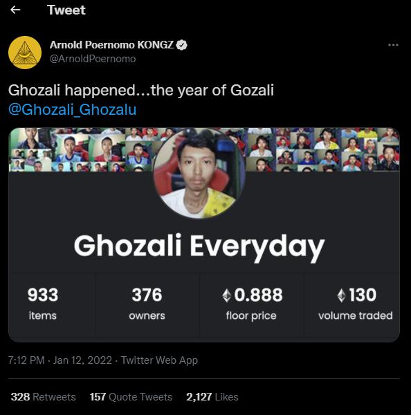 最先购买并宣传他头像的是印尼名厨Arnold Poernomo,他在Twitter上有2100万的粉丝。日常会关注转发NFT相关的推文,而其在发布Ghazal的NFT项目时,大赞“the year of Ghazal”。这条推文的讨论也是其2022年以来,数据表现最好的推文。