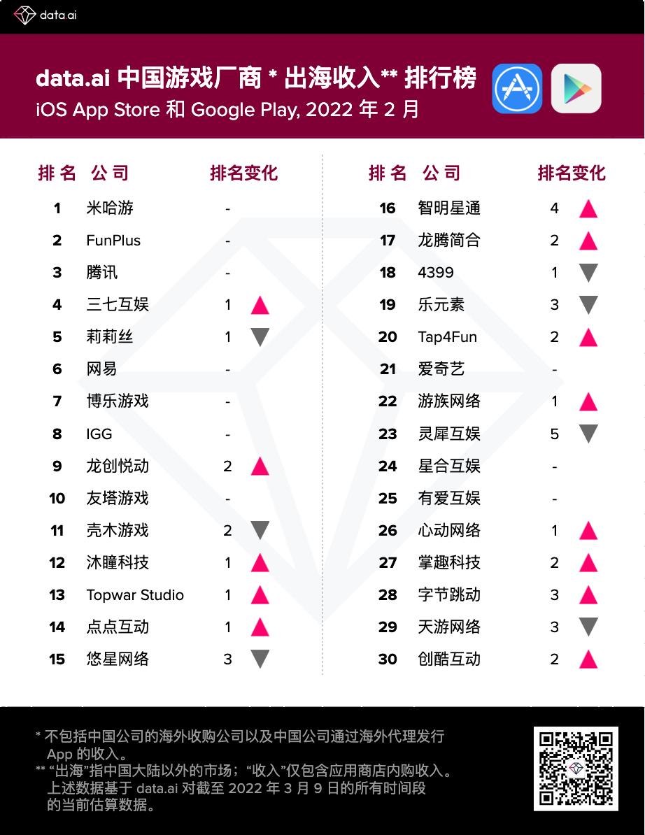 出海榜单:2022 年 2 月中国游戏厂商及应用出海收入 30 强