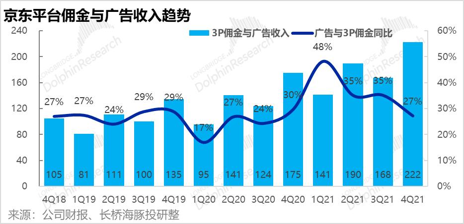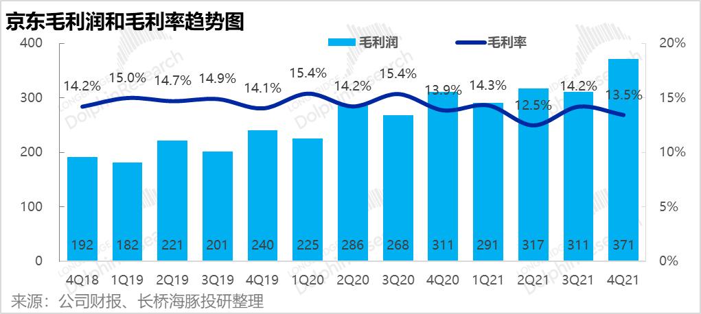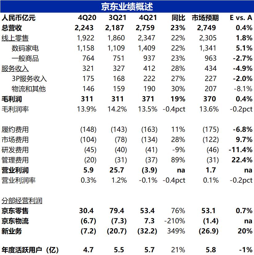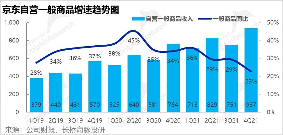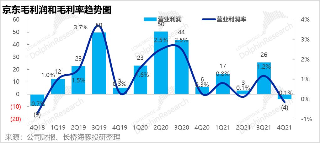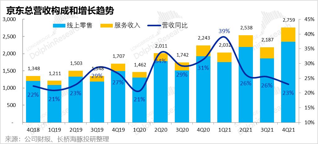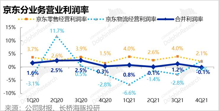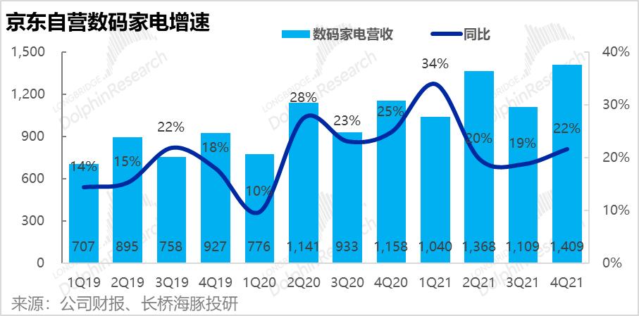 1.首先京东的基石业务--1P自营零售本季度收入2,347亿元,同比增长22%,略微高于市场预期的2305亿元。本季增速与上季度的22.9%基本一致,而全社会线上零售大盘4季度同比增速则从3Q的8%,显著下降到4%。因此京东在行业逆风中,仍在顽强前行,市占率提升。