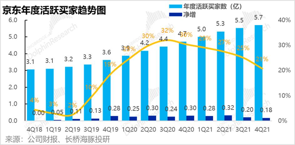 截至2021年4季度末,公司年活跃用户数达5.7亿人,少于市场预期的约5.8亿人。本季环比净增用户1800万人,在电商旺季的4Q用户增长反而显著减少,表现绝对是不让人满意的。长桥海豚君认为,背后原因或是京喜及社区团购等下沉平台的用户增长放缓所致。