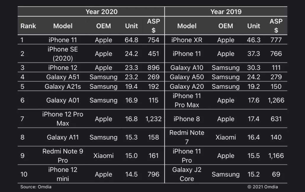 结果,仿佛来自上个十年的 iPhone SE 2 成为了一匹黑马,成为 2020 年第二畅销的手机,仅次于 iPhone 11,小胜首尝 5G 的 iPhone 12。