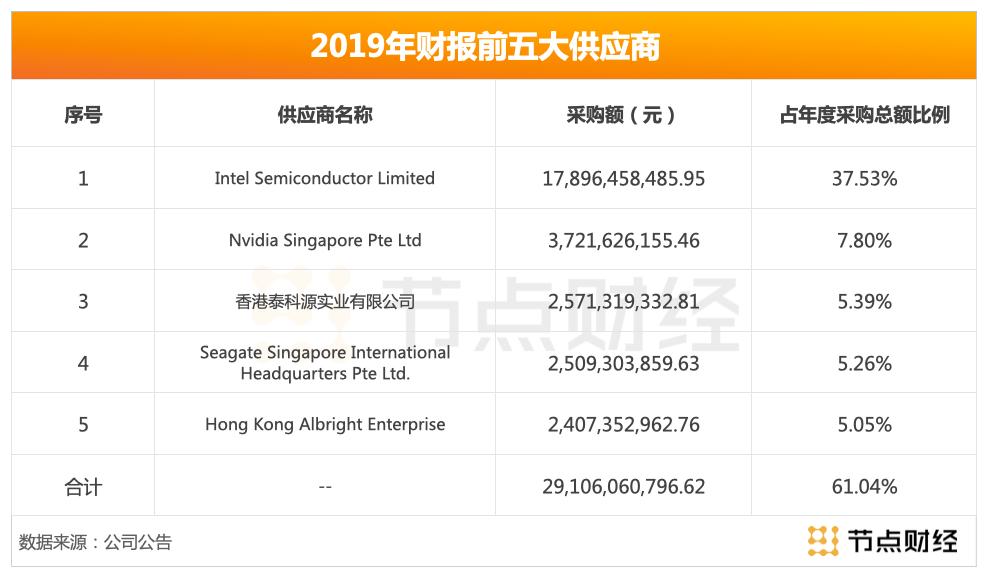 前文已经说明了浪潮信息在通用服务器领域的市场地位——中国NO.1,世界NO.3。但其症结所在是在产业链中的地位左右夹击。根据其在2019年年报披露的数据,前两大供应商分别是,处于垄断地位的英特尔与英伟达;而浪潮信息下游客户群则是寡头阿里云、百度云等。所以浪潮信息虽然是市场龙头,但议价能力却不强。