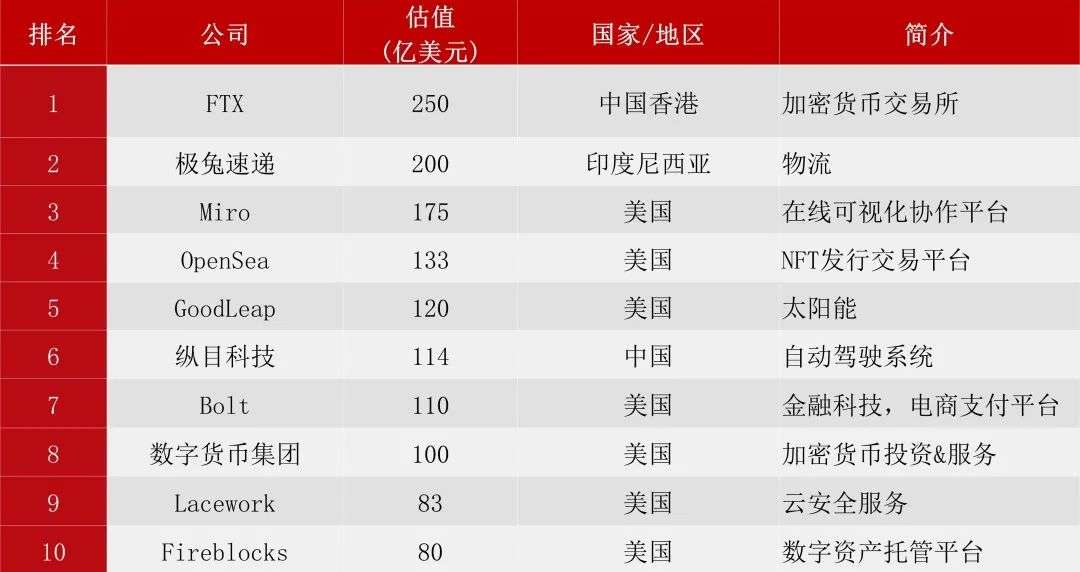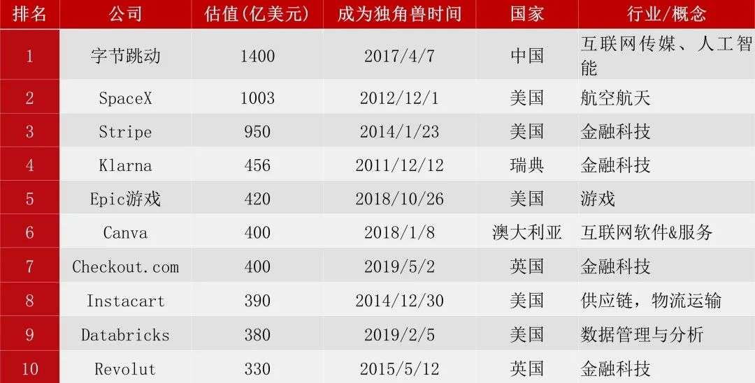 表 1 2021年全球估值前十的独角兽榜单,资料来源:CB Insights