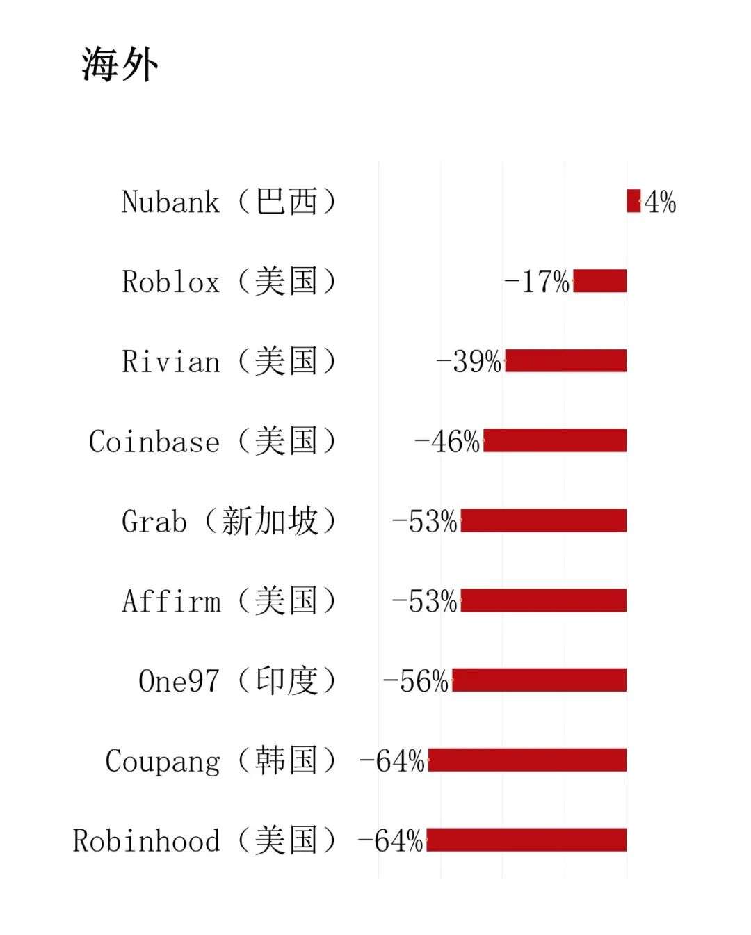 2021年内,海外的许多明星独角兽也完成了在股票市场上市,然后其中大部分在股票市场的不佳表现则倒是反映出了它们在一级市场上估值的虚高,招致了不少争议。比如号称“元宇宙第一股”的少儿编程游戏平台Roblox、一整年仅卖了不到一千辆车却炒上千亿市值的电动卡车厂商Rivian、东南亚版“滴滴”Grab、机器人流程自动化平台软件开发商UiPath、在“散户vs华尔街”中发挥了重要作用的Robinhood、美国最大的加密货币交易所Coinbase、“印度支付宝”Paytm母公司One97 Communications等。