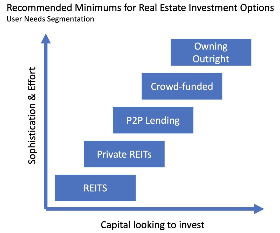 虽然房地产投资有很多选择,但普通个人投资者的五种选择包括公共房地产投资信托(REITs)、股权众筹(类似于私人REITs)、点对点贷款、众筹和直接购买建筑物。在哪里投资以及为什么投资取决于许多因素,但其中两个因素包括你的成熟度和资本水平。更进一步,考虑细分市场的一种方法是建议最低复杂度和精力,以及寻求投资的资本。