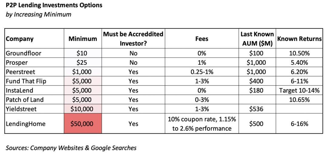 与其他私人投资选择一样,已知的回报难以核实。但声明的回报率似乎合理,介于 6% 到 11% 之间。Groudfloor最低只有 10 美元,回报率为 10.50%。像 Prosper 和 Peerstreet 这样规模较大的资产管理公司的资产管理规模均为10亿美元,但回报率分别为5.40%和6.20%。LendingHome 是最知名的参与者之一,其最低投资额为 50,000 美元。
