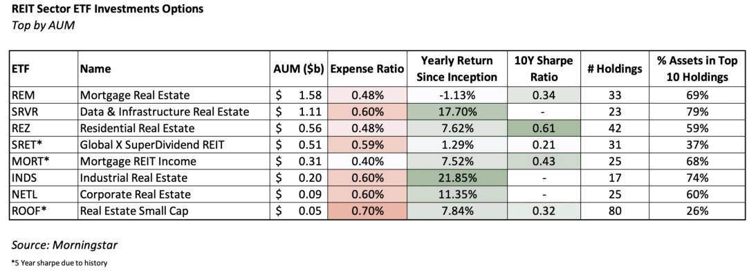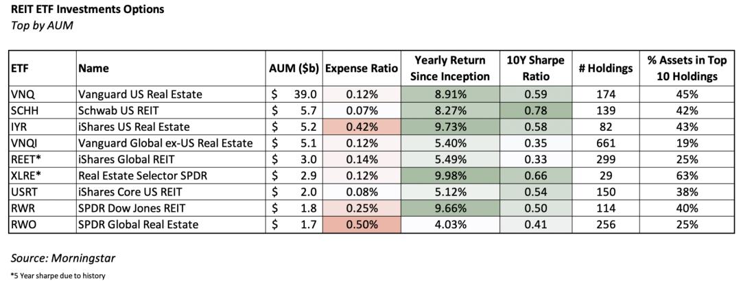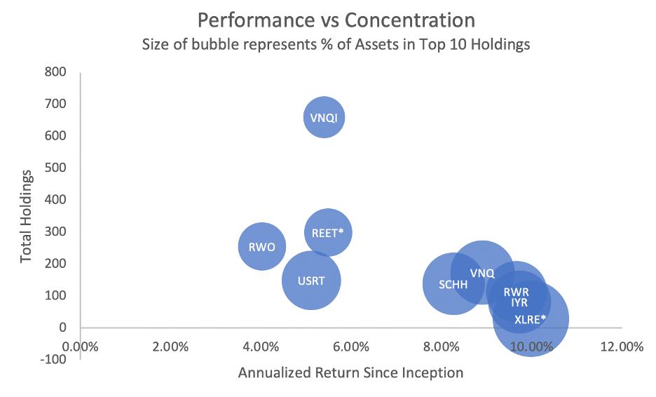 REIT ETFs 展示了房地产(以及任何)市场的一个基本面:您承担的风险越大,获得超额回报的可能性就越大。集中在前10名的交易所买卖基金(ETFs)在总持股量和持股百分比方面表现出色。尽管影响这种相关性的因素很多——包括ETF的发行时间、美国最近的相对表现——但“风险越大,回报越高”的基本原则是明确的。