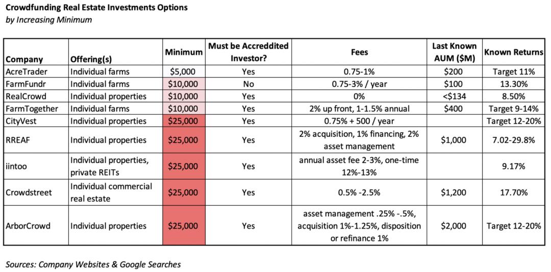 Crowdstreet 和 ArborCrowd 似乎是该领域最大的参与者之一,资产管理规模分别为12亿美元和20亿美元。不过,它们的最低限额是25000美元。Crowdstreet声称回报率为17.7%。这比任何 P2P 借贷选项都要高。它类似于最高级别的私人 REIT 或个人公共 REIT。总体而言,人们的共识似乎是,这些资产的表现可能与公开房地产投资信托基金类似或低于公开房地产投资信托基金。