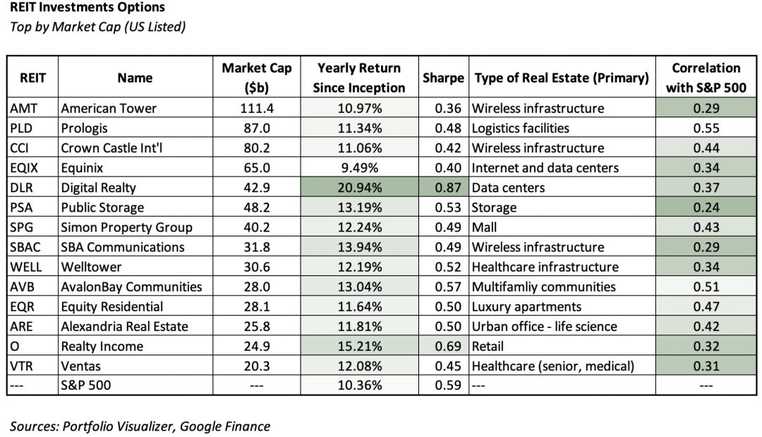 个人房地产投资信托基金让投资者可以选择投资特定的管理团队和公司,这取决于他们的资产组合。如果你在获胜者出现时就选择了他们,那么你的年回报率往往高于标准普尔500指数。在美国最大的房地产投资信托基金中,唯一一家自成立以来没有超过标准普尔500指数的房地产投资信托基金是Equinix。标准普尔500指数的这一优异表现正是投资者所追求的,他们投资于任何单个REIT,即任何风险更高的选项,如eREITs、P2P贷款和直接持有。