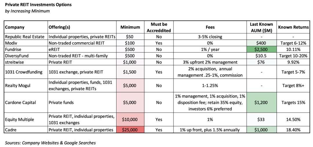 房地产众筹平台的、私人 REITs 或具有不同名称的类似工具,为投资者提供了投资于未公开上市公司的类似 REIT 结构的机会。这些公司本质上比公众公司规模小,因此在风险范围中更为突出。他们通过高效和强大的团队选择优质房地产/贷款篮子,提供更高回报的潜力。然而,它们的最低价格高于公共房地产投资信托基金的 1 美元。最低限额是 50美元。