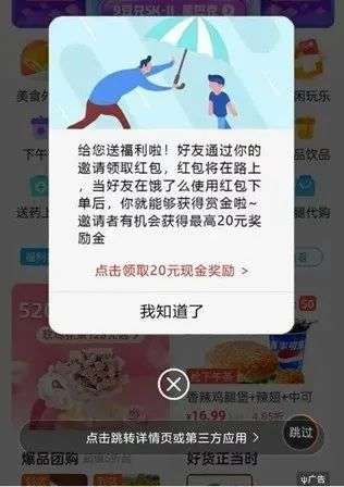 美女红包是人们可能会感兴趣的内容,那什么东西是你必须点的?系统弹窗信息。把广告做成高仿真的系统通知的样式,“红包到账、内存已满、网络断开、系统维护、知道了、请刷新…… ”,非常有可能会被用户当成真的通知点击。只是点击之后,不是通知消失,而是跳转到了另一个App上。