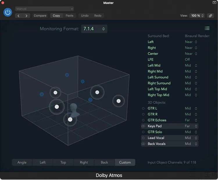 苹果Logic Pro的杜比全景声界面,可以看到需要手动指定音源而不是音箱的位置