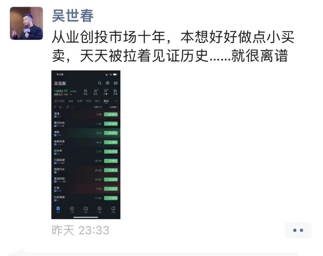3月11日晚,中概股又崩了,梅花创投创始合伙人吴世春在朋友圈感叹:“从业创投市场十年,本想好好做点小买卖,天天被拉着见证历史.....”