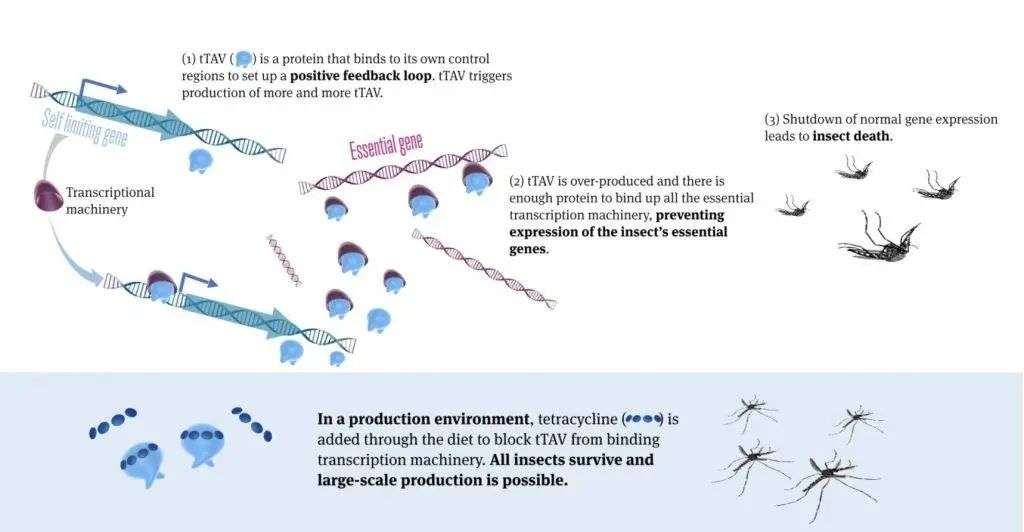 Oxitech 通过 Friendly 技术让雄蚊携带「自限性基因」,当被释放的雄蚊与野生的雌蚊进行繁殖时,它们的后代就会携带这种基因。「自限性基因」会通过在蚊子细胞内过量产生蛋白质来破坏细胞的正常功能,从而干扰细胞产生发育过程中所需蛋白质的能力,无法存活到成年。