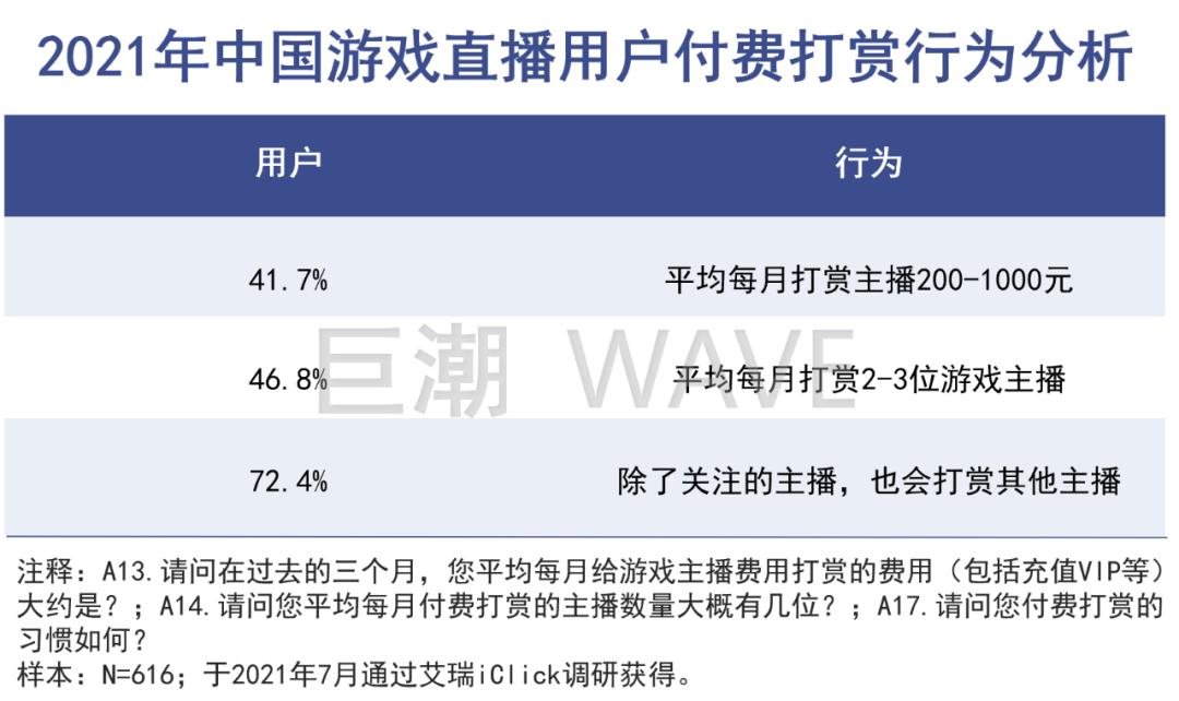 根据艾瑞咨询的数据,游戏直播用户互动行为中付费打赏主播的比例为41.1%,且其中47.1%的用户平均每月打赏金额200-1000元,更多的用户以发送弹幕、订阅为主。结合近几年的情况来看,直播中付费打赏业务在中国游戏直播市场营收占比逐年上升,但增长的幅度总体较小。