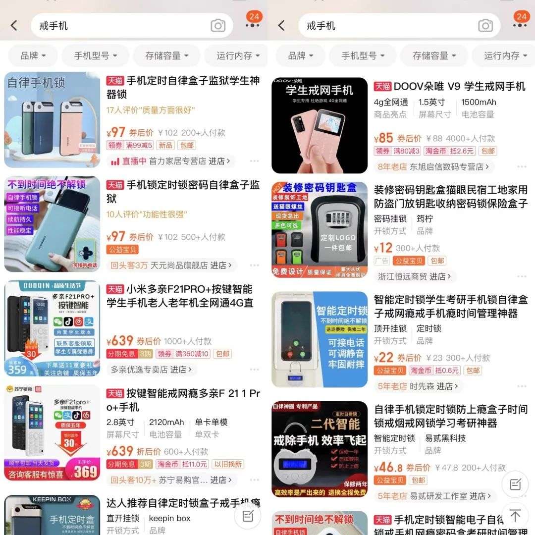 在淘宝搜索“戒手机”这个关键词,已经可以看到一串“手机隔离盒”产品,单价都在百元左右。