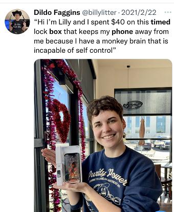 就连老外也顶不住淘宝神器的魅力,在推特上,一个女孩手捧手机隔离盒心满意足地微笑:“大噶好我是丽丽,我花了40美金买了这个手机隔离盒,我有个没的自控力的猴脑,而这个盒子让我远离手机。”